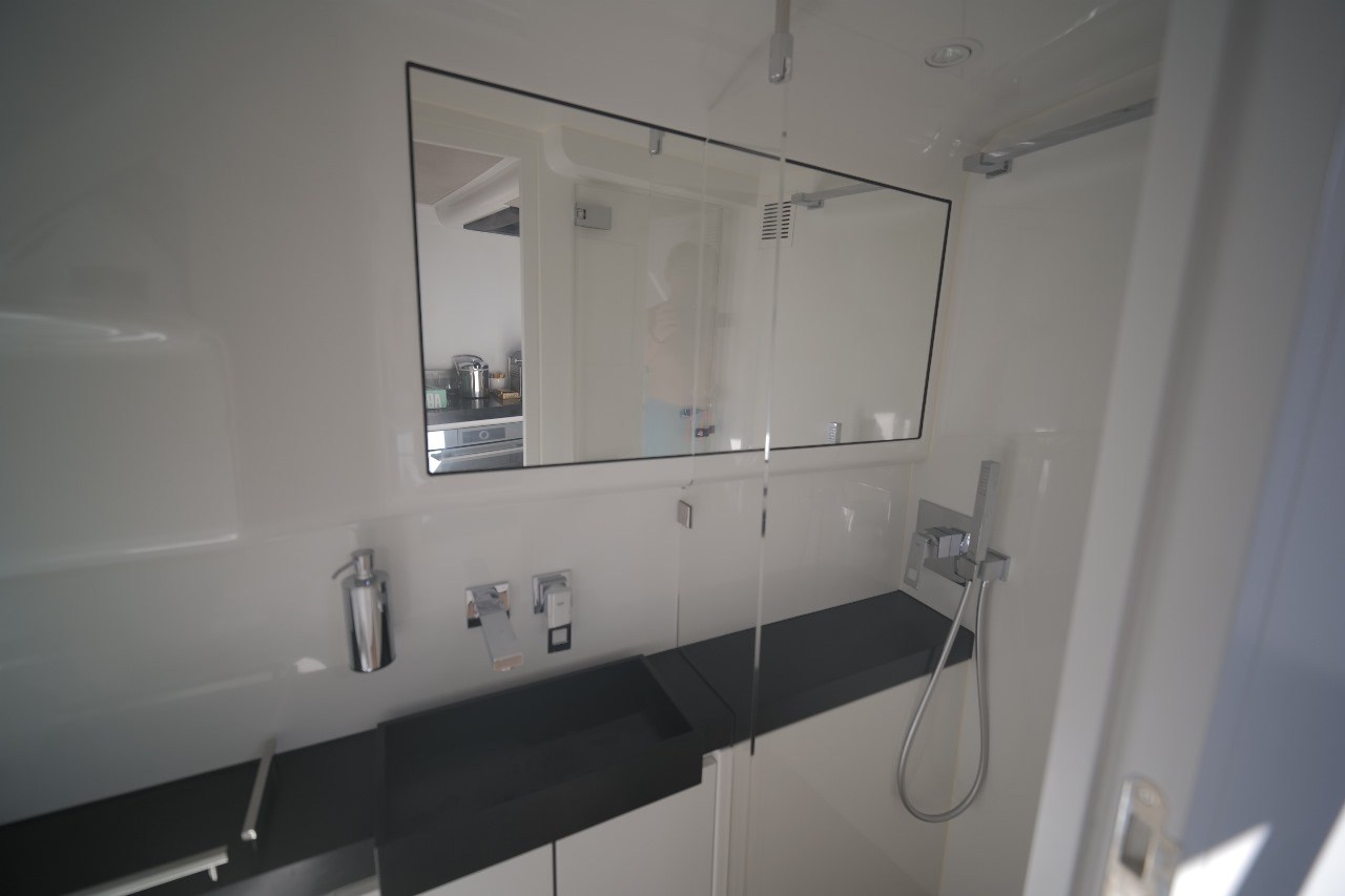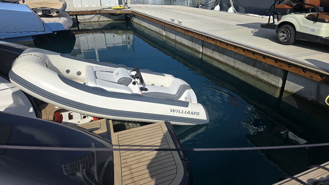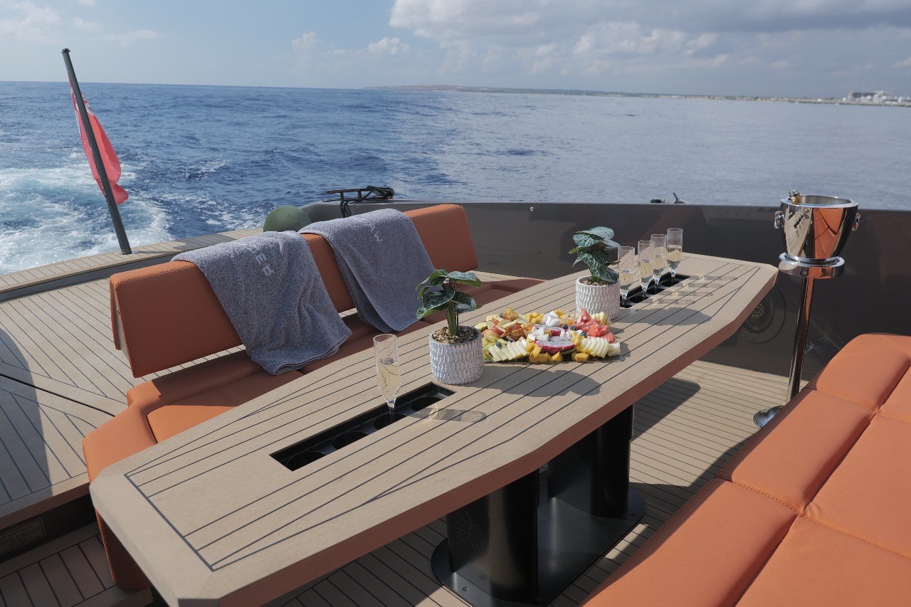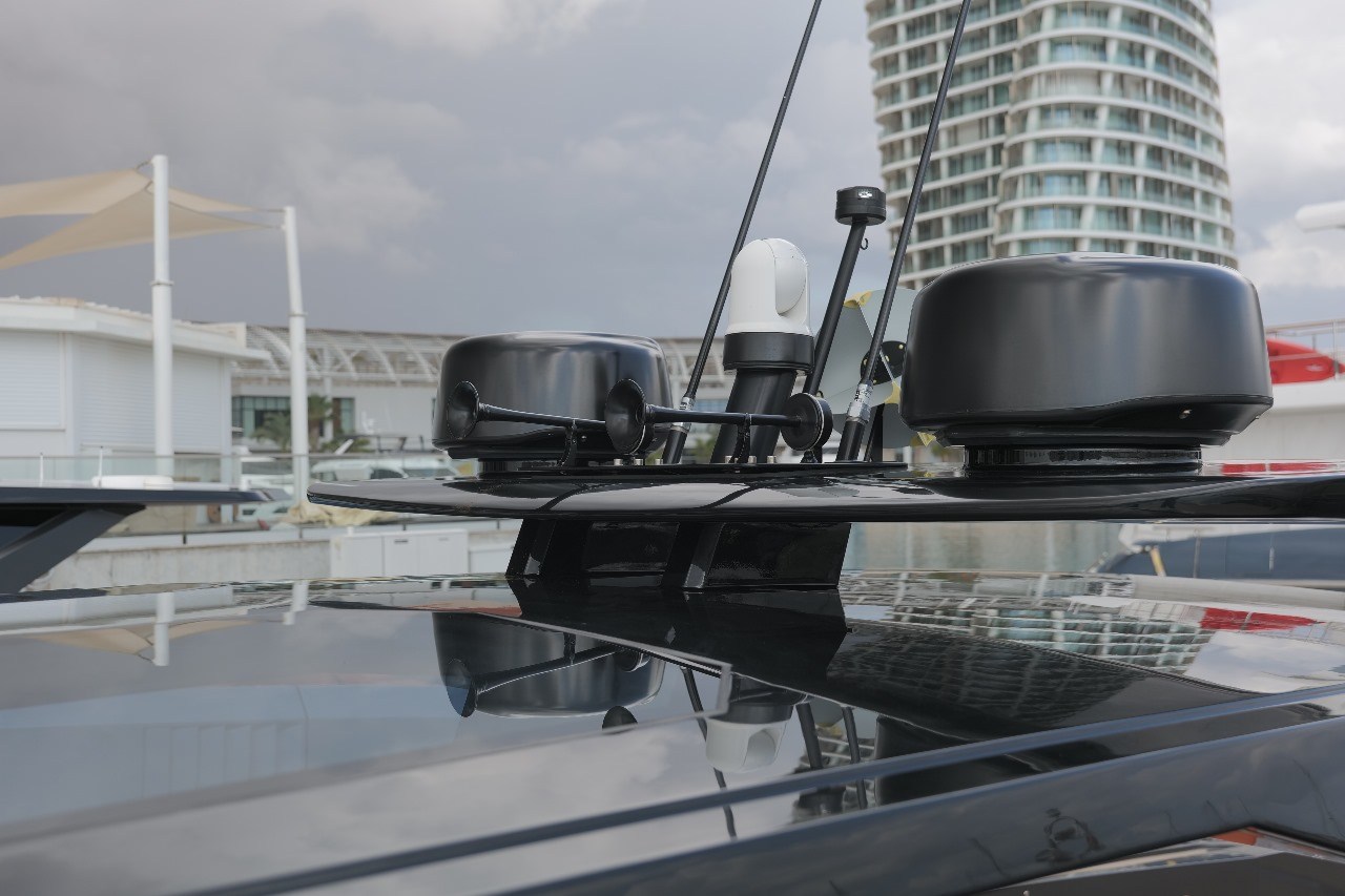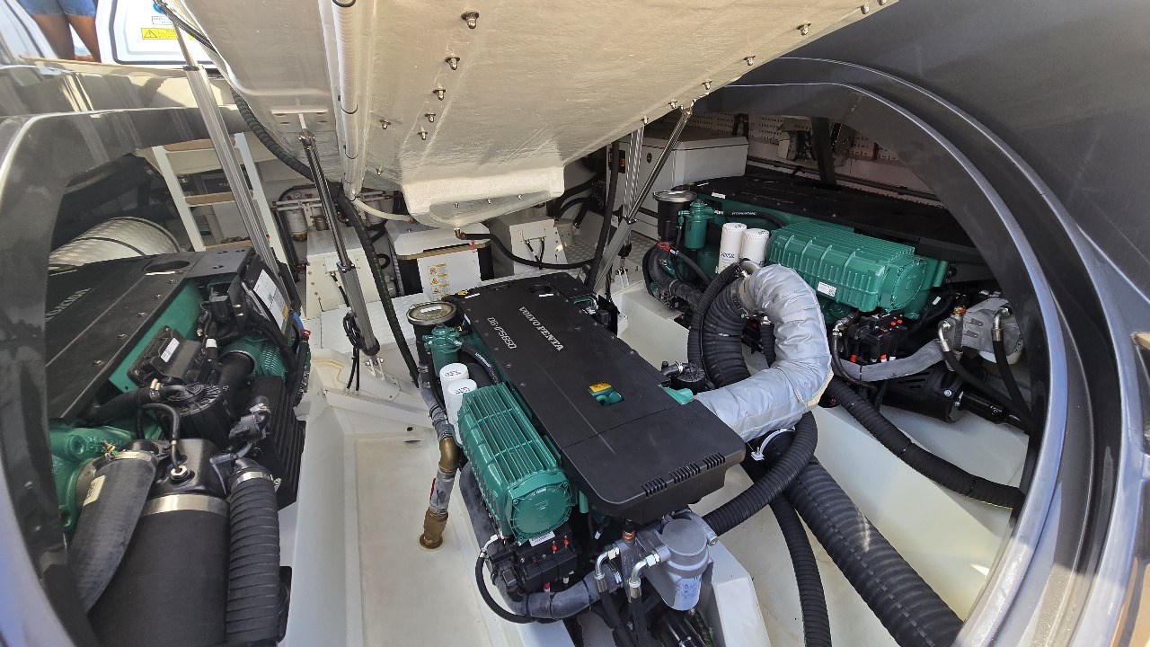 Anchor, Anchor Chain Washdown, Auto Dynamic Trim Interceptor, Automatic Bilge Pump, Auto-Trim, Batteries, Battery charger, Bilge Alarm, cockpit table, Courtesy Lights, Deck Shower, Electric Bilge Pump, Electric Windlass, Fire Extinguishing System, Hard top, Horn, Jet Boat, Shorepower connector, Special Colour, Tender, Tender Garage.